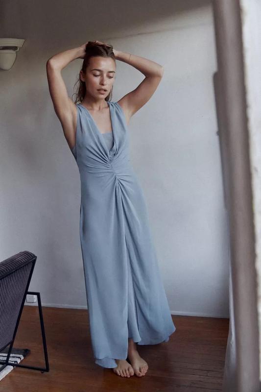 XS-XL Платье миди с V-образным вырезом и широкими бретелями из эластичной ткани в виде пчелиных сот. Собранные детали и обработанный подол с разрезом спереди. Съемная внутренняя подкладка в тон. Застежка на спине со скрытой молнией и металлическим крючком.