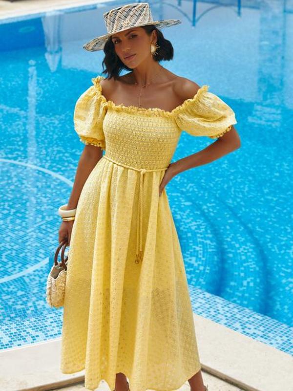 ‼️ОТПРАВЛЕНИЕ ВПРОДОВЖ 2-5 РАБОЧЫХ ДНЕВ!!️ФОТО ВЖИВУ Платье из высококачественного турецкого материала. Верх оформлен вафельной резинкой для комфортной посадки по фигуре. Открытые плечи и короткие рукава добавляют образу романтики. Отрезная талия визуально формирует силуэт, а расклешенная юбка с подкладкой струится при ходьбе. Съемный пояс-шнурок из той же ткани создает акцент, дополняющий образ. Размер: 44, 46, 48. Цвет: синий, розовый, хаки, бежевый, желтый, черный, Материал: 100% хлопок Состав подкладки: 100% хлопок 902132/3