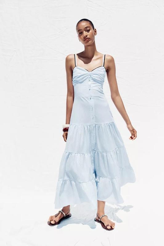 XS-XL Платье с V-образным вырезом, украшенное сборками и контрастным комбинированным кружевом. Тонкие регулируемые бретели. Декоративные пуговицы спереди. Эластичная вставка на спине в виде пчелиных сот. Боковая застежка-молния, скрытая в шве.