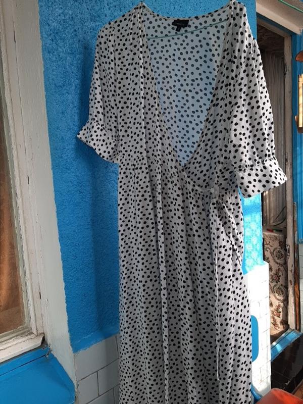 Белое платье в горох на запах, имеет пуговицы, пояс, очень красивое. Есть нюанс - стрелочка, на последнем фото отобразила, не заметна при носке. НОГ 52см НОТ 45см ПОБ 72см- свободные Длина от плеча 116 см. Условия сотрудничества: 100% оплата на картку. Возвращение нет. Пожалуйста, сделайте покупки взвешенно.