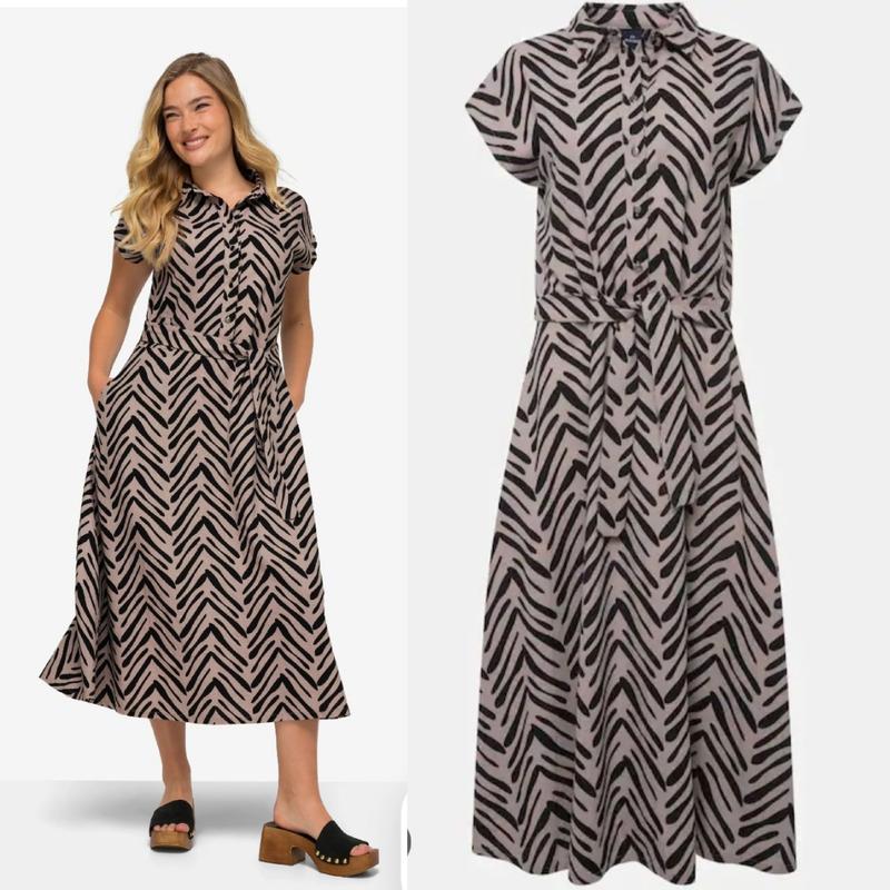 декоративный принт в стиле зебры приятно прохладная льняная смесь, плавно падающая Воротник рубашки, планка с пуговицами Завяжите пояс на талии. Платье из льняной смеси с декоративным принтом в современном стиле с эффектом зебры. Воротник рубашки, застежка на пуговицы до поперечного шва, пояс на талии. Спущенные плечи, короткие рукава. В составе 55%-лен, 45%-вискоза Указан размер М-40/42Новое сток без бирки Без подкладки Сьемный пояс Цена на сайте 80 евро ПОГ-56 ПОТ-48 регулир пояском ПОБ-72 длина изделия от плеча-124