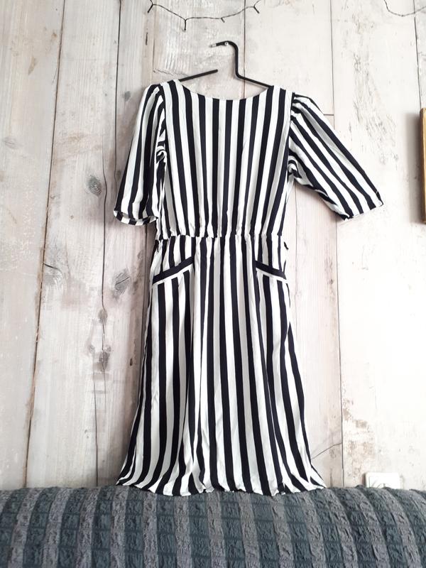 Винтажное платье-халат с карманом белое в черную полоску с застежкой сзади р s