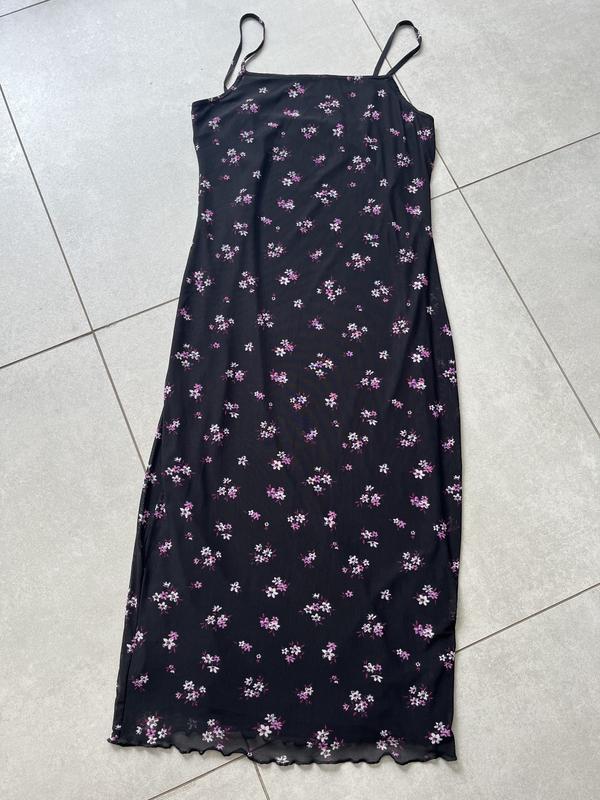 Стильне платтячко, довжина міді, гарно сідає по фігурі, знизу підкладка, зверху сітка з квітковим принтом. Розмір М. Тягнеться, в новому стані