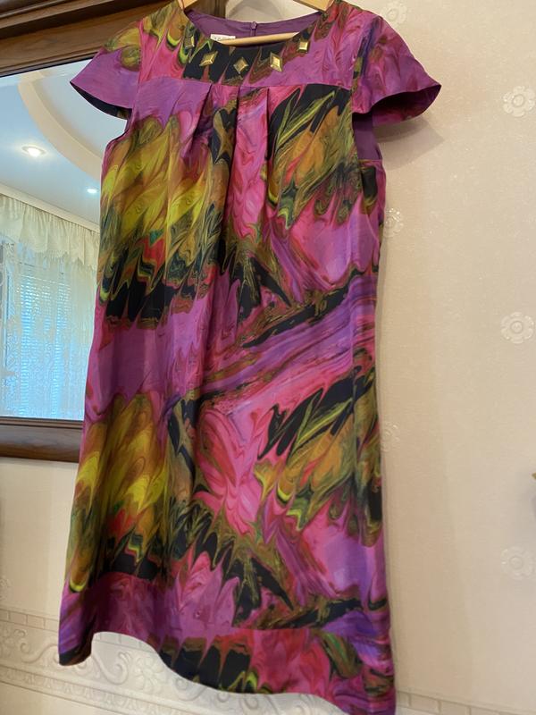 Яскрава сукня з натурального шовку. Кольори: малиновий, зелений, жовтий , чорний і відтінки. Фасон трохи трапеція. По плечам спереду і ззаду кокетка, від якої спереду закладені мʼякі складочки. Рукав короткий типу крильце. Спереду по горловині нашиті декоративні елементи. Розмір вказано 16 (42), але швидше на 14. Орієнтуйтеся по замірам і замовляйте безпечну оплату. Заміри: НОГрудей 50-51 см Талія 51 см Стегна 55 см По низу 64 см Довжина по спинці 97 см Рукав короткий крильце 15 см Плече 7,5 см По спинці довга молнія