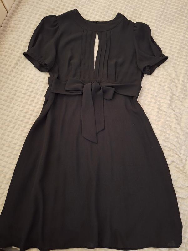 Сукня чорного насиченого кольору, має підкладку, не просвічує, З переду виріз, на спинці ще один, комір на маленьких гудзиках, по талії також гудзики, має пасок, який можно зав'язати як із ззаду, так із переду, рукав типу ліхтарика, на гудзику. Стан ідеальний, розмір 14, наш 48. Заміри: довжина 93см., ПОГ 42см., талія 39см., стегна 46см.