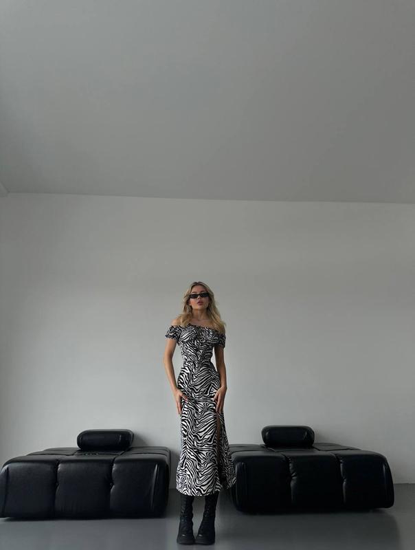 Сукня 🔥 Арт.231 Ткань: качественный софт Размер: 42-44, 44-46 Цвет: зебра Идеальное базовое платье ❤️ платье миди самого универсального кроя, которое подчеркивает талию и красиво открывает ключицы ❤️ рукав на резинке и кулиска на комди