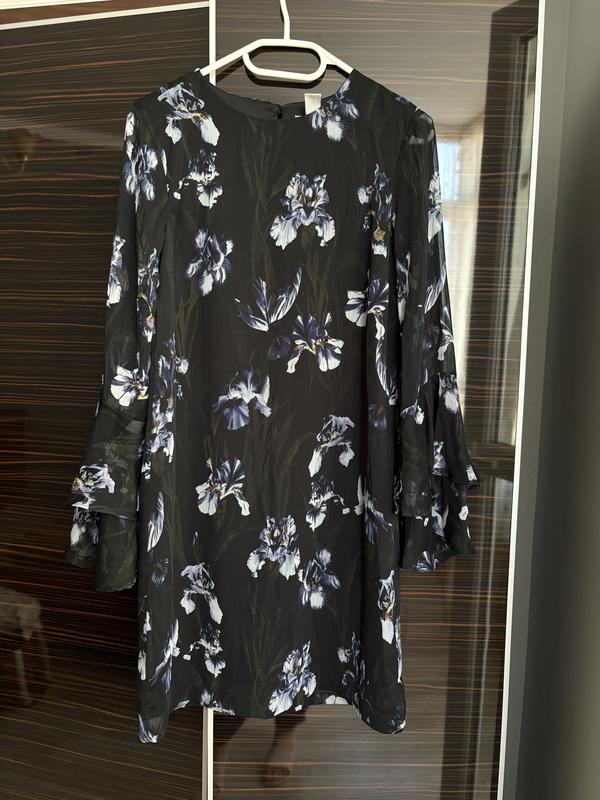 Чорна міді сукня з ірисами та ажурними рукавами, xs-s розмір