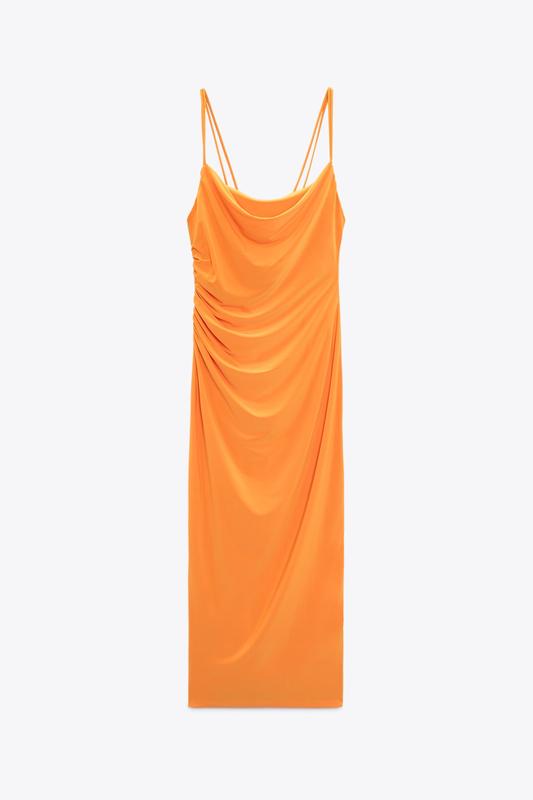 Платье миди с драпированным вырезом и тонкими двойными бретельками.... Где грудь идет топ-бандо двойной а затем еще спущенная основная часть Тканина тягнеться Бедра 49 Талия 36 Длина 115 см Грудь свободно потому что ткань тянется и присобрана а сам топ замер передней части изнутри 48 см а произвольно со спинкой то 38 см
