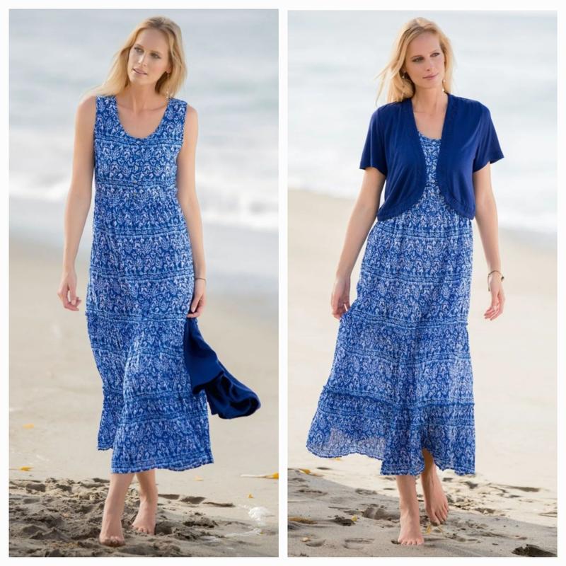Хлопковое ярусное голубое платье-сарафан миди в белый принт damart(размер 40)
