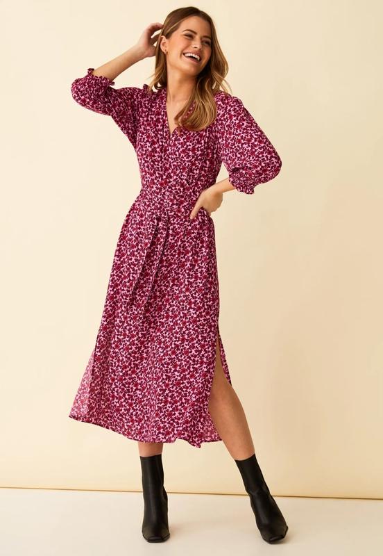 Вискозное платье миди,лиф с запахом,ззади по талии резинка, по бокам имеет разрезы, в носке не была.Пог 54-56, запах,пот 42-49,ззади резинка, по боку 63, длин рук 45, длин пл 43/125.