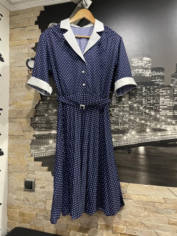 Сукня міді темно синя в білий горох з білим коміром,застібається на 3 гудзики до талії,на талії є пояс,рукав короткий з білими манжетами,є плечики,розмір L,орієнтуйтесь по замірах.ПОГ 58 см,ПОТ 42 см,ПОБ вільний,довжина 110 см.