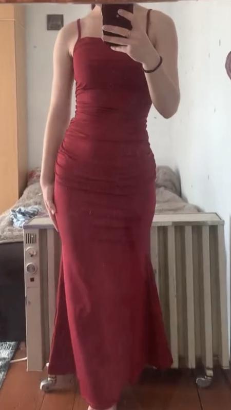 розмір S/M, сукня тягнеться, тому підійде на розмір M. стан новий, ідеальний, ні разу не носила, одягала лише для примірки, сукня міді, бордова