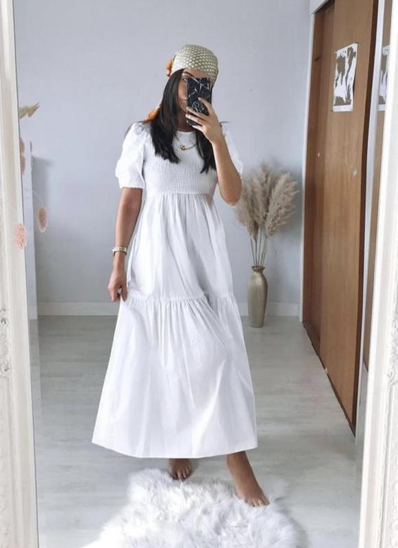 Новое платье с короткими рукавами-фонариками и эластичными манжетами. Присутствующие боковые карманы. Сзади связки на шее. Бирки отсутствуют. но ни разу не надевали.