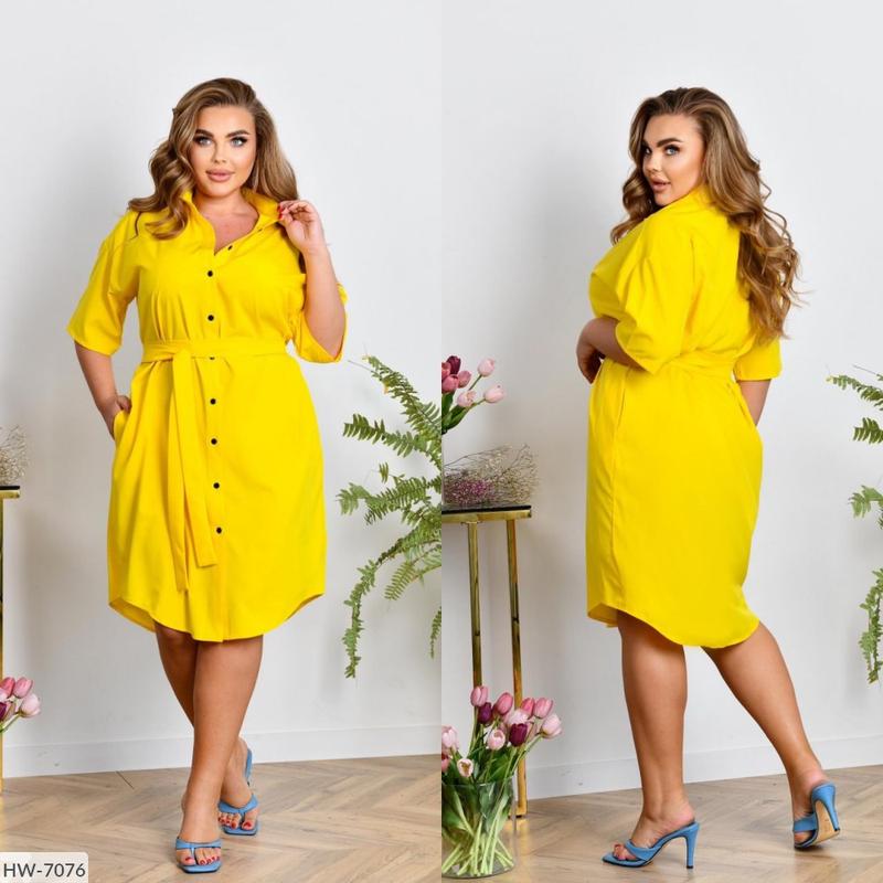 Сукня HW-7073 Код 3584 Размеры: , 52-54, 56-58 Цена 550 грн. Тканина: софт. Цвет: желтый Длина платья: 107, 110, 113, 116, 119 см. Длина рукава: 23, 24, 25, 26, 27 см. Обхват рукава: 44, 46, 48, 50, 52 см. Замеры готового изделия: 48-50 ОГ 112 ОТ 116 ОС 128 52-54 ОГ 120 ОТ 124 ОС 136 56-58 ОГ 128 ОТ 132 ОС 144 60-62 ОГ 136 ОТ 140 ОС 152 64-66 ОГ 144 ОТ 148 ОС 160 На модели размер 52-54 Рост 170 см. ОГ 108 ОТ 85 ОБ 115 см Платье-рубашка из легкого софта. Застежка на пуговицах по передней планке. Воротник стояче-отложной. В боковых швах обработаны карманы. В комплекте пояс из основной ткани (можно носить без пояса).