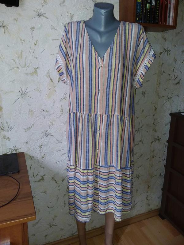 Размер XL, евро 48/50, смотрите внимательно замеры. Стан идеален, без дефектов. Тканина тонка, не тягнеться. 70% вискоза, 30% лён. длина от верхней точки плеча до низа 103. длина рукава от горловины 27. полуобхват бицепса 25. полуобхват груди 58. полу охват талии 57. полуобхват бедер 75. 28/8