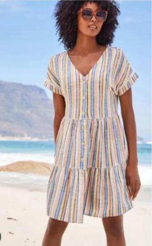 Ярусное платье в полоску Next с добавлением льна. Размер L. Ноаа, сток, без бумажной этикетки. 70% вискоза, 30% лён. Очень легкое свободное платье. Цена 670 грн. Длина 100 см (от плеча до юбки 47 см), ПОГ 57 см, ПОТ 54 см.