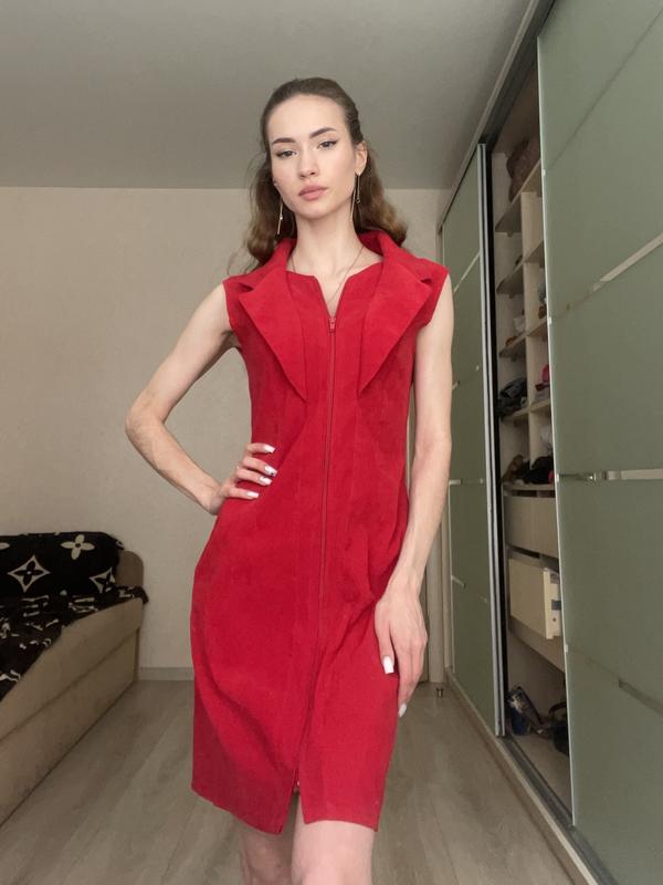 Сукня червоно кольору, зі змійкою посередині по всій довжині Без рукавів, з виразним коміром