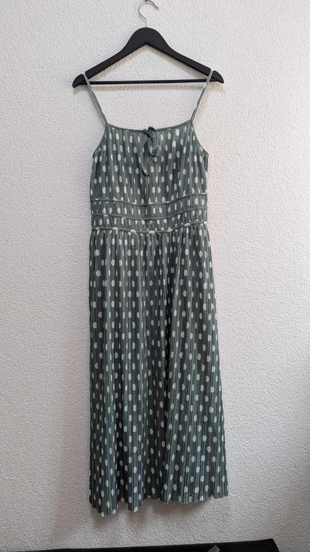 Зеленое летнее платье в белый горошек на бретельках. Имеет завязку спереди. Размер: 42 Состояние: идеальное. Нет никаких дефектов и повреждений. Материал: 100% полиэстер. Замеры: ■ длина спереди - 112 ■ длина по спинке - 103 ■ полуобхват груди - 38 ■ полу охват талии - 37 ■ полуобхват бедер - 51