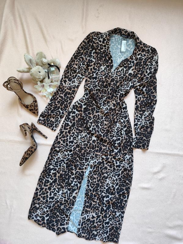Платье миди леопардовый принт р 36 38 s M 44 46 с разрезом с рукавом НОГ 47 НОТ 32-43 НОБ 49 Длина 121 Рук 62 Пл 39