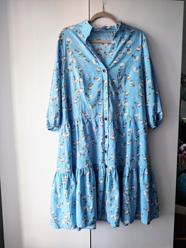 Женское, летнее платье. Размер 54-56. Одягались один раз. Длина 104, талия 60, бедра 85,рукав 47 см.