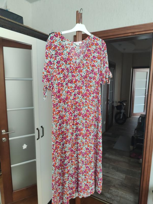 Легкое летнее платье, 100% вискоза, подойдет на девочек с пышными формами. Имеет сбоку замочек для удобства, на рукавах завязки. Цветочный принт. полуобъем груди 55 см полуобъем талии 47 см длина изделия по спине 117 см длина рукава (фонарика) 25 см Дефектов нет.