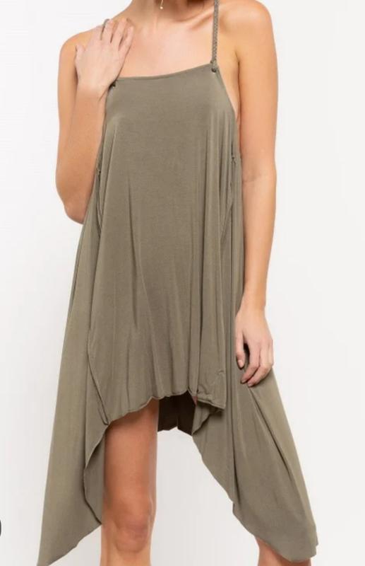 Легкое, свободное платье-трапеция миди длины/одноцветная туника с асимметричным низом, с вышивкой на узких бретелях, цвета хаки, от итальянского бренда