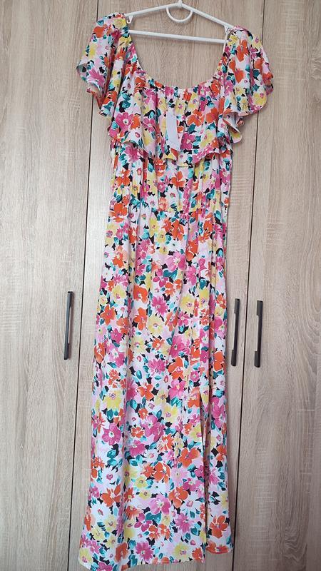 Новое платье в цветочный разноцветный принт. На плечиках волан. С разрезом на ноге. Красивая, стильная, романтичная, натуральная, легкая, фирменная и качественная. Замеры: ПОГ 53-60 ПОТ 40-50 В бедрах свободное длина 130 Производитель Турция