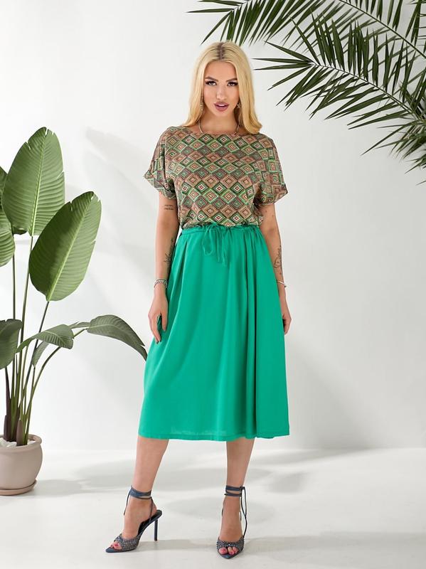 Платье женское арт 200855 407 Изящное платье, сочетающее легкость и комфорт, создано для тех, кто ценит эстетику в деталях. Верх выполнен из принтованного штапеля и имеет цельнокроеный рукав с манжетом, что добавляет мягкости и непринужденного шарма. Отрезная талия подчеркнута кулиской, которая позволяет регулировать посадку и создавать желаемый силуэт. Нижняя часть платья пошита из однотонного стейч-льна и украшена встречными складками спереди и сзади, что придает изделию структуру и объем. В боковых швах расположены удобные карманы, которые гармонично дополняют практичность этой стильной модели. Размеры 44,46, 48, 50, 52, 54 Тканина Льон Склад 95% льон, 5% еластан