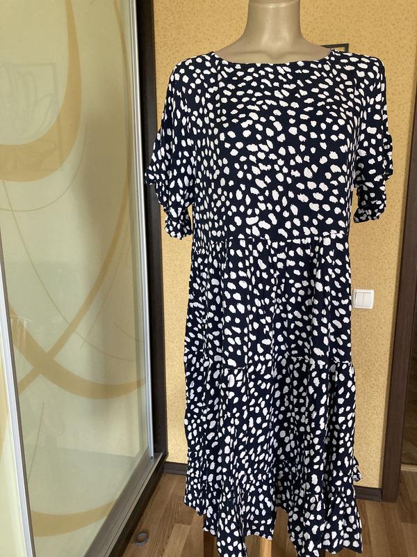 Чудове літне плаття в стилі Бохо, короткі рукави, три яруси юбки, легке не парить, 100% віскоза Плечі 9 ПОГ 56 Від горловини по переду до першої лінії відрізу 24 Загальна довжина від горловини по спині 90 Довжина рукава 20