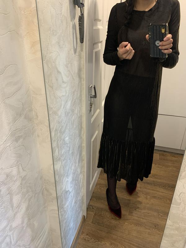 Черное полупрозрачное платье миди, черная с золотом, на манжетах резинки очень стильно смотрится, переливается золотом