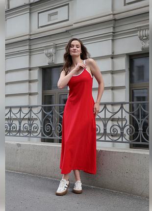 Платье-майка из трикотажа кулир – свобода движения и стиль каждого дня. Легкость, удобство и спортивная эстетика в одной модели. Это платье-майка создана для активного лета: мягкий трикотаж кулир (95% хлопок, 5% эластан) дарит телу комфорт и дыхание даже в самые жаркие дни. Свободный крой идеально сидит на любой фигуре, а контрастная окантовка по линии горловины и проймам добавляет динамики и визуальной структуры. Она не имеет застежек и карманов – только максимум свободы и минимум лишнего. В таком платье удобно гулять, путешествовать, заниматься спортом или отправиться на кофе с подругами. Достоинства модели: ✔️Эластичная и дышащая ткань. ✔️Не сковывает движений - идеальна для активного стиля жизни. Актуальная длина меди ✔️Гармонично сочетается с кедами, босоножками или шлепанцами. ✔️Легкий уход: стирать при 30°C, сушить в горизонтальном положении. Идеально для температуры от +20 °C — базовый вариант для лета и отпусков.
