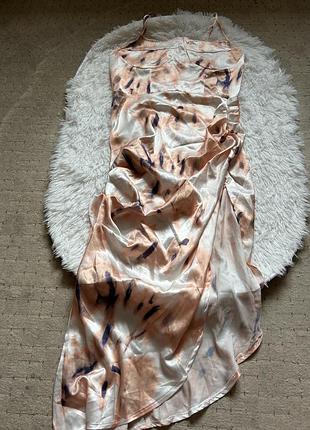 Легка та неймовірно приємна до тіла сукня на тонких бретелях — ідеальний варіант для літніх днів або вечірніх прогулянок. Виготовлена з гладкої шовковистої тканини з абстрактним принтом у персиково-бежевих та темно-синіх відтінках. Модель має легкий приталений силует, делікатно підкреслює форми та красиво струмує під час руху. Завдяки асиметричному низу та драпіруванню виглядає особливо витончено.