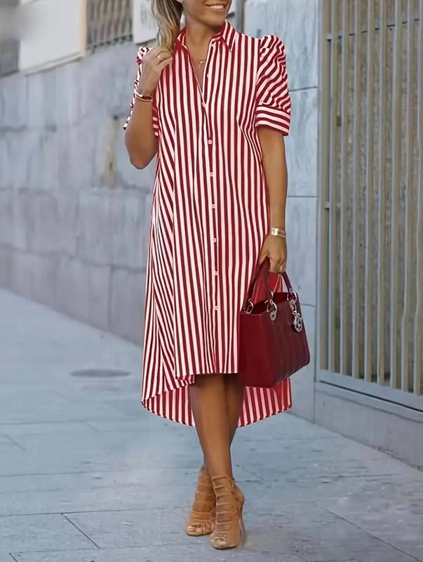 Платье рубашка в красно-белую полоску Размер ХЛ - 2ХЛ Замеры на последнем фото (параметры тела и одежды) короткими рукавами Тканина поліестер, застежка на пуговицы по всей длине, воротник с лацканами,