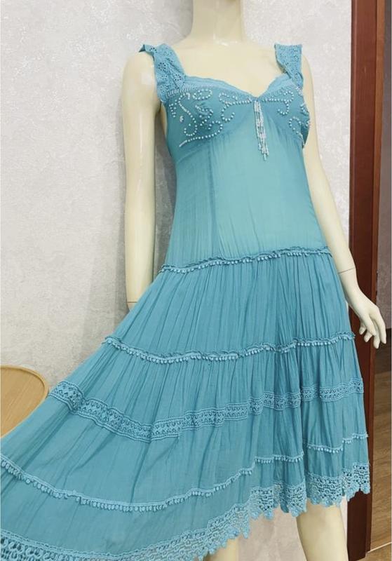 Шикарное хлопковое ярусное платье сарафан миди бирюзового цвета с кружевом! Застежка-молния в боковом шве, нижняя часть и лиф на подкладке! Бретели и юбка украшены хлопчатобумажным кружевом, на лифе - вышивка бусинами! Указан размер 40, подойдет на M-L, ориентируйтесь на замеры: Длина от плеча - 106 см ПОГ - до 52-52 см ПОТ - до 42 см ПОБ (по подкладке) - около 55 см