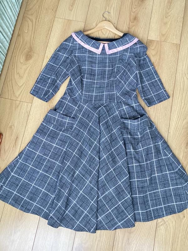 Сукня з цупкого матеріалу, сірого кольору в ніжно рожеву клітинку з кишенями та комірцем, додатково до сукні йде пояс. Рукав три чверті Дуже зручна та стильна сукня, ідеально підійде як для святкового вбрання так і для повсякденного образу Плечі 40 Груди 49 Рукав 43 Талія 45 Довжина 106