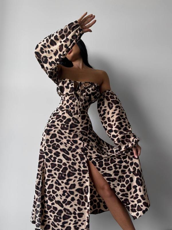 Ефектна леопардова сукня міді софт з розрізом і довгими обʼємними рукавами