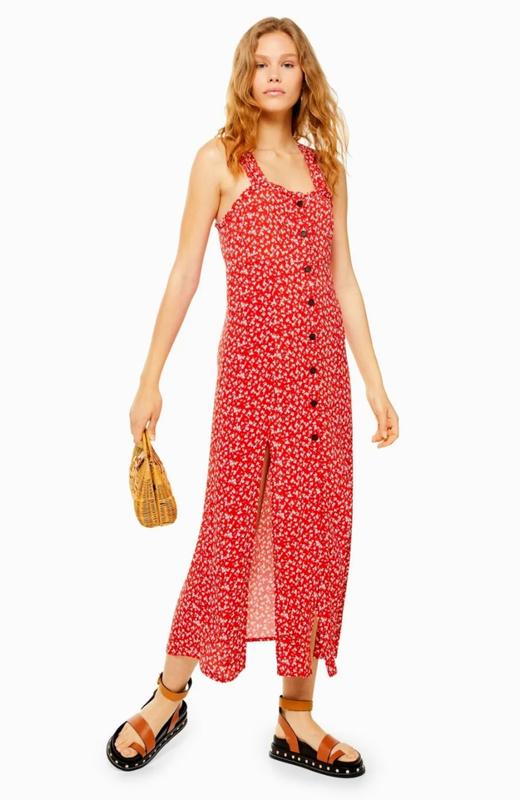 Яркое красное платье в цветочек, спереди разрезы, рабочие пуговицы. Размер по бирке UK10/EUR38/US6. Длина миди.
