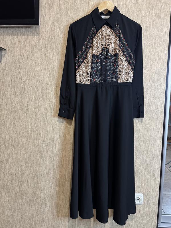 Сукня , плаття Stenia з принтом у змішаній техніці Sandro, оригінал, розмір 38 Ідеальний стан Бокова бірочка зі складом зрізана Заміри Довжина від горловини До талії 34 довжина від горловини до низу 120 , 5 довжина до талії Від плеча 40 довжина від плеча до низу 123 ПО талія 35 , 5 пог 48 Рукав 57 плечі 41 , 5 рукав від горловини 70 Опис з сайту Характеристики Довгі рукави з манжетами на ґудзиках Застібки на ґудзики на ліфі з принтом бандани А-силует Плісована спідниця Довжина міді Матеріали Та Догляд: 100% поліестер; спідниця та рукави: 70% віскоза/30% шовк