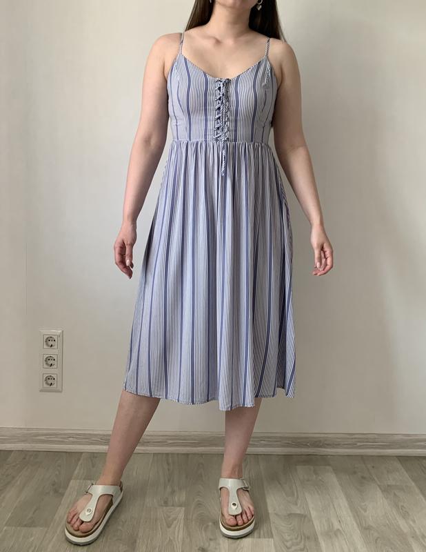 Сукня у смужку блакитного кольору Розмір Л, але маломірить на М 100% віскоза Довжина з лямками 111 см, напівобхват грудей 43 см Стан ідеальний