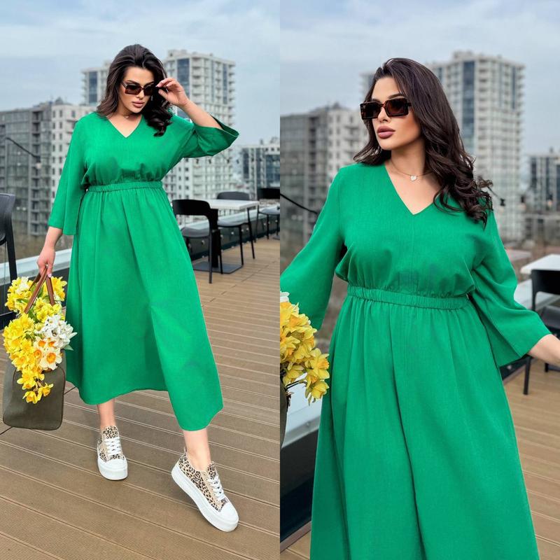 Арт 2195har+ Тканина льон Цвет черный, шоколад, зеленый, синий Размер 48-50, 52-54, 56-58 заміри надам за потреби Длинное платье с v-вырезом на груди, по низу посередине разрез. Рукав 3/4, резинка под грудью, с карманами.