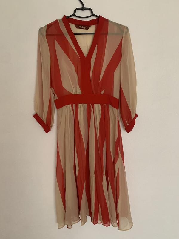 Стан - идеальный Размер XS,S Тканина 100% шовк,тканина легенька прозора Сбоку на молнии Цвет красный в сочетании со свет бежевым