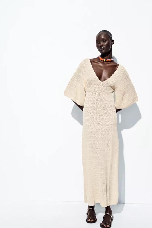 Довга сукня з V-подібним вирізом і короткими рукавами. Прямий поділ. БЕЖЕВИЙ | 3390/006/450