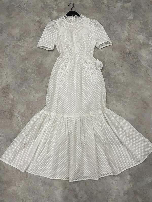 Розкішне плаття довжини мiді, повністю з 100% котону, із вишивкою, фактурною тканинною основою та мереживними вставками. Дуже ніжне, повітряне, виглядає дорого. Ідеальне на літо, святкову подію, хрестини або просто на вихід. Не можу знайти фото на оф сайті на моделі з коротким рукавом 🥹 Колекційна модель — зараз коштує 5800 грн на офіційному сайті. Склад: 100% коттон ‼️ Підходить тільки тілесна білизна — білу буде видно, як під будь-яким білим одягом. Розмір: EU 36 🔸 Довжина: 119 🔸 Пог: 42–43 🔸 Пот: 33–34 🔸 Поб: 47 🔸 Рукав: 26 см Сядет на розмір S (на талію до 64)