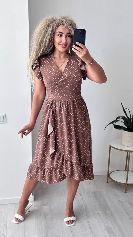 Женское летнее платье миди на запах в горошек с поясом и воланами
