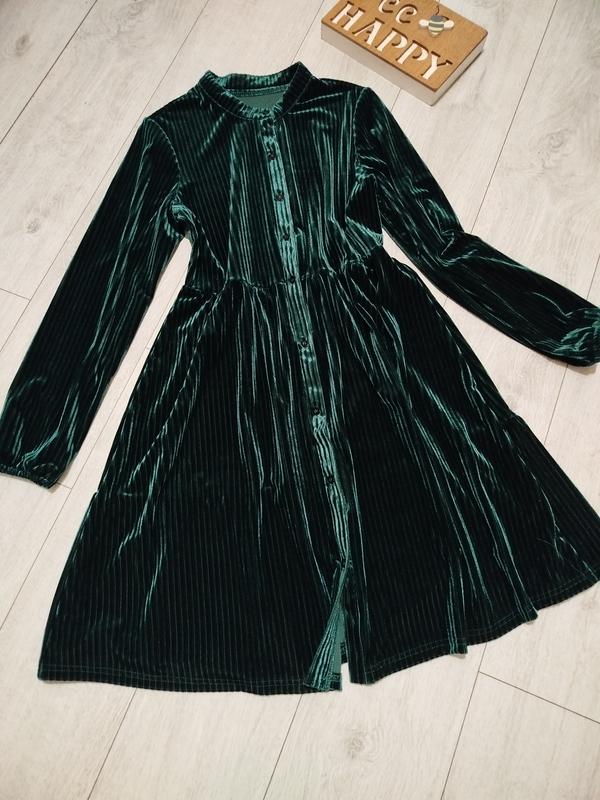 Суперовое, велюровое, изумрудное платье с длинным рукавом. Красиво тянется. Спереди на пуговицах по всей длине. Размер указан L. Замеры на фото. Подойдет на новогодние и рождественские праздники! (10)