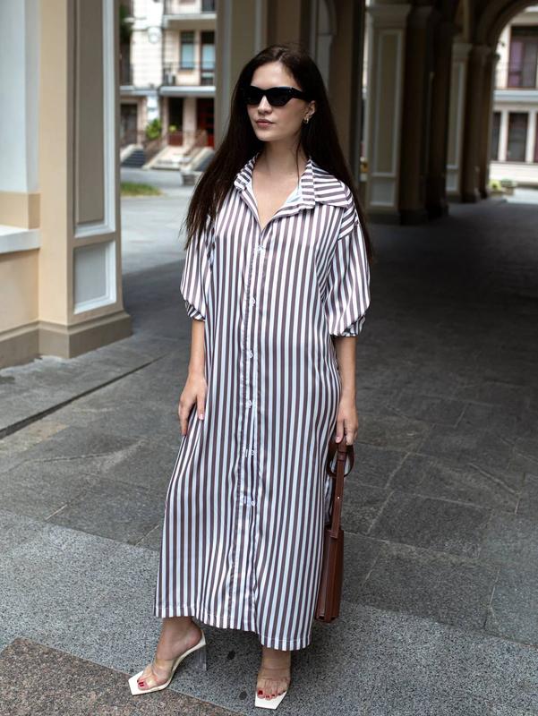Платье женское продолговатое шелковое свободное для беременных в полоску на пуговицах с ко...