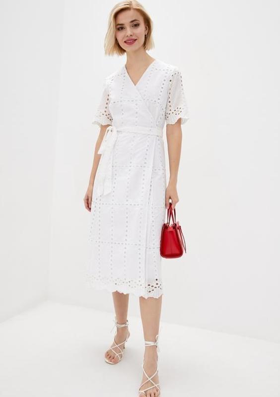 Возле правой подмышки незначительный дефект ткани-снимки 8, при носке практически незаметно. Шикарное дизайнерское платье миди на запах из прошвы от Андре Тана. На подкладке. Рукава без подкладки. Размер по набору XS. Замеры +- так как крой на запах и немного можно регулировать параметры. ПОГ 41 см + витачки ПОТ 32 см ПОС 43 см Длина 116 см Ширина в плечах 36 см. Состав: 100% хлопок.