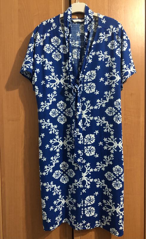 Натуральна тканина, цікавий принт, V образний виріз, по боках розрізи, можна як під пасок так і вільно, для літа сама досконалість. ОГ 52, ОБ 55, довжина 98.