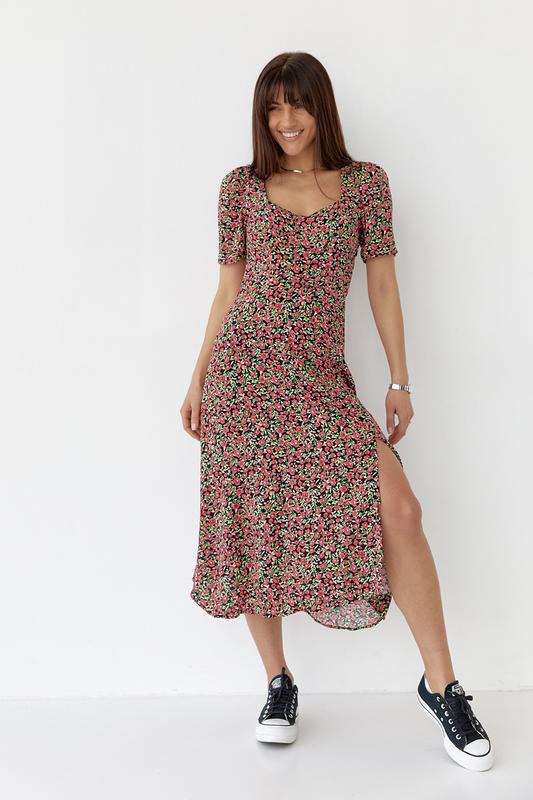 ЗАМІРИ ВИРОБУ Ширина під проймами рукавів (над грудьми), см S - 38см; M - 40см; L - 42см Довжина рукава від горловини, см S - 32см; M - 33см; L - 34см Довжина рукава по внутрішньому шву, см S - 10см; M - 10см; L - 10см Ширина по талії/поясу, см S - 35см; M - 37см; L - 39см Довжина виробу, см S - 117см; M - 117см; L - 117см РОЗМІРНА СІТКА ХАРАКТЕРИСТИКА ТОВАРУ Країна Туреччина Тканина Віскоза Склад тканини 100% віскоза Параметри моделі 84*60*92 зріст 173 Розмір на фото S ОПИС АРТ. 2357 Мода на принти регулярно змінюється, але квіткові мотиви завжди повертаються. Ця модна літня сукня довжини міді зробить твій силует ідеальним, подарує легкість і комфорт твоїй шкірі. У моделі короткі рукави без резинки, горловина фігурна. Відрізна талія йде без резинки, а під грудьми розташований додатковий шов, який збирає верх виробу у м'які складки. Низ виробу з прямими краями, а в лівому бічному шві розташована довга блискавка. В низу спідниця спереду прикрашена високим розрізом у районі лівої ноги.