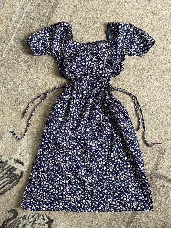 Неймовірна сукня, сідає по фігурі, на талії декоративні вирізи із затяжками, рукави ліхтарики Заміри : довжина від плеча 111 см, під пахвами 45, рукав 30, талія регулюється завʼязками, спідниця від талії 74 см Колір темно - синій з квітами